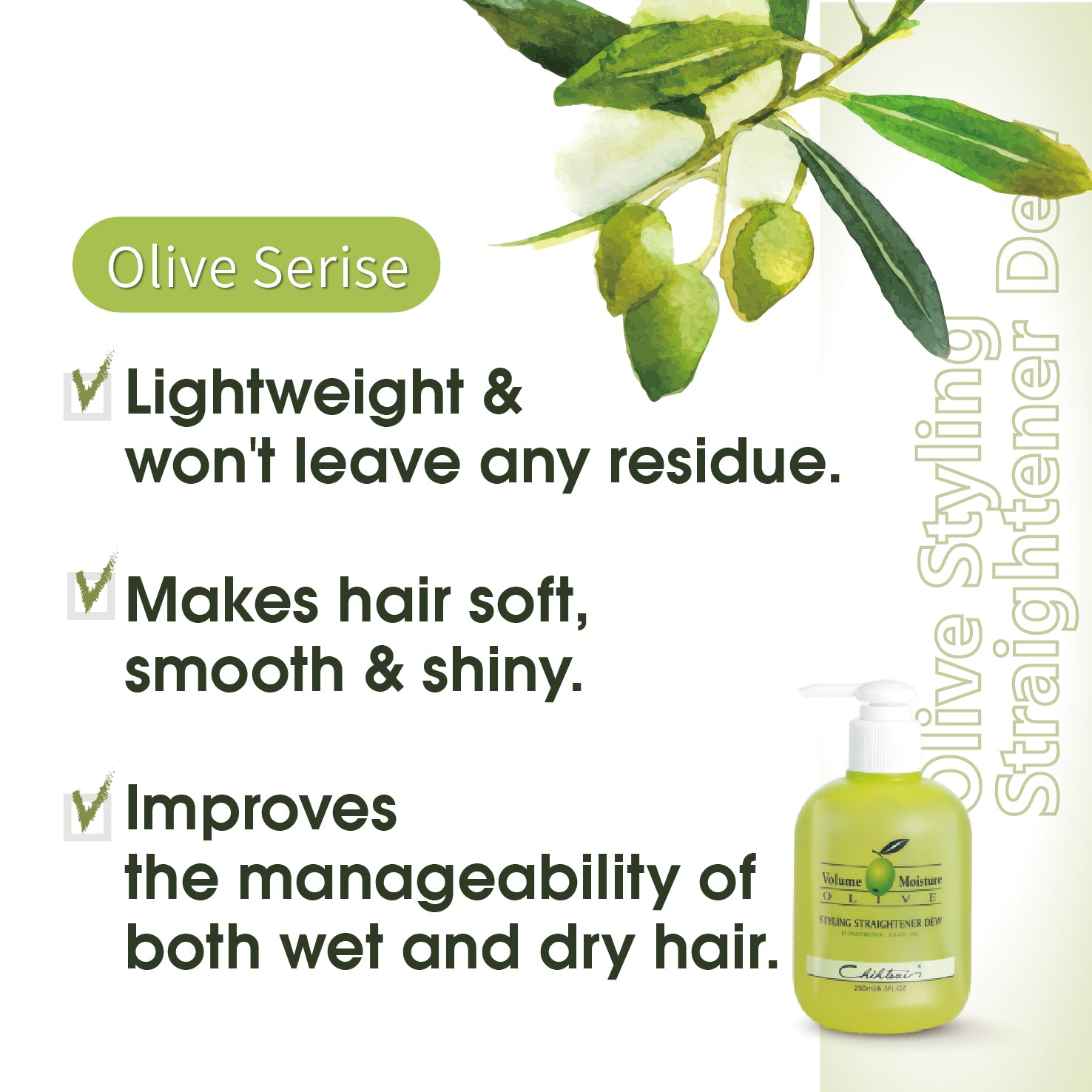 The Olive Styling Straightening Dew is a styling product perfect to keep your hair straight for long time without residues.